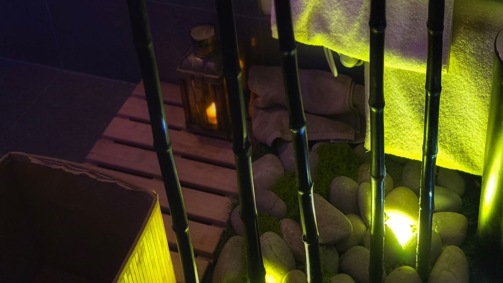Warm lighting, soft water feature and the comfort of a space create for recovery, with a side of modest luxury.